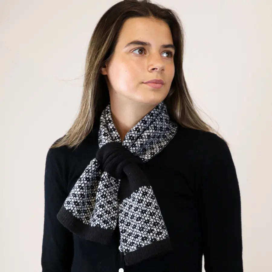 A stunning recycled blend pull through scarf in black & white with retro Scandi flower knit.