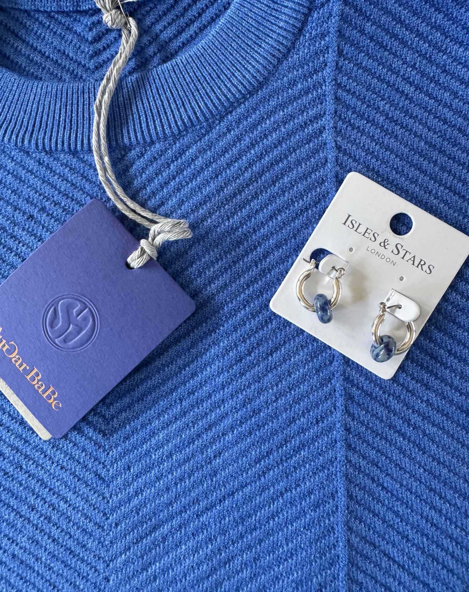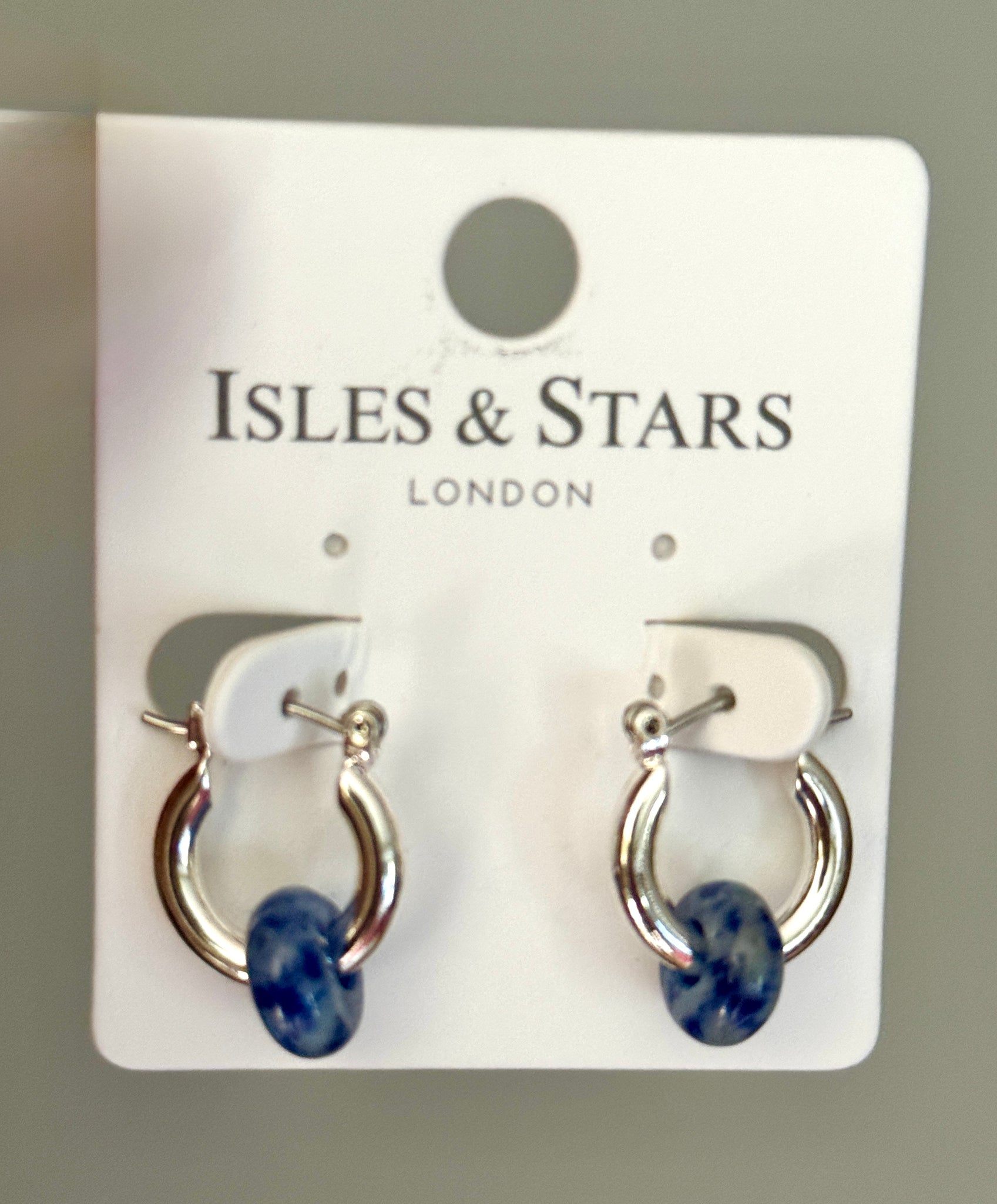Super cute chunky round hoop earrings with a decorative blue stone bead.