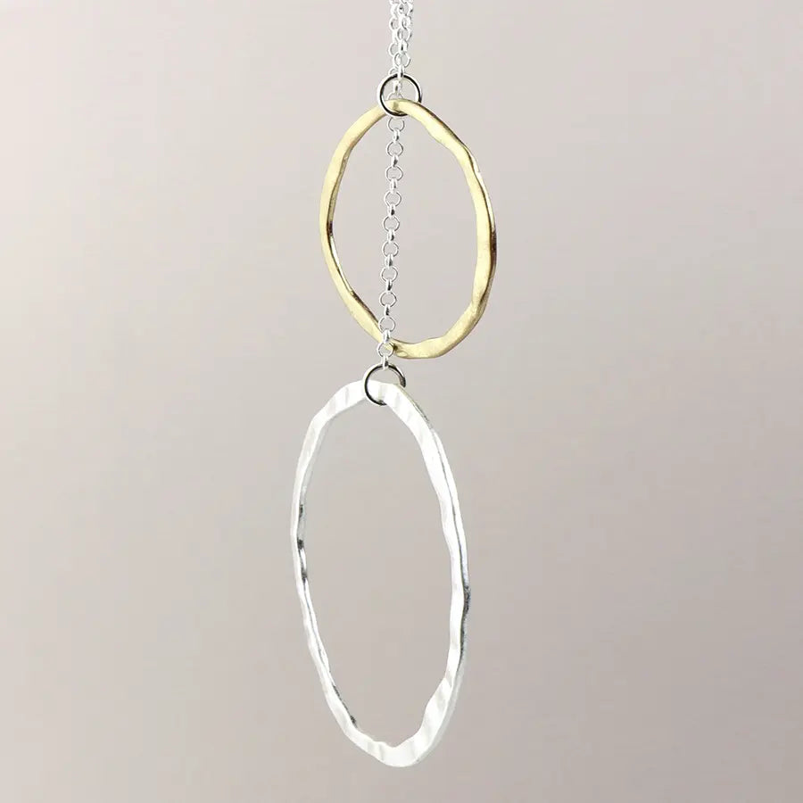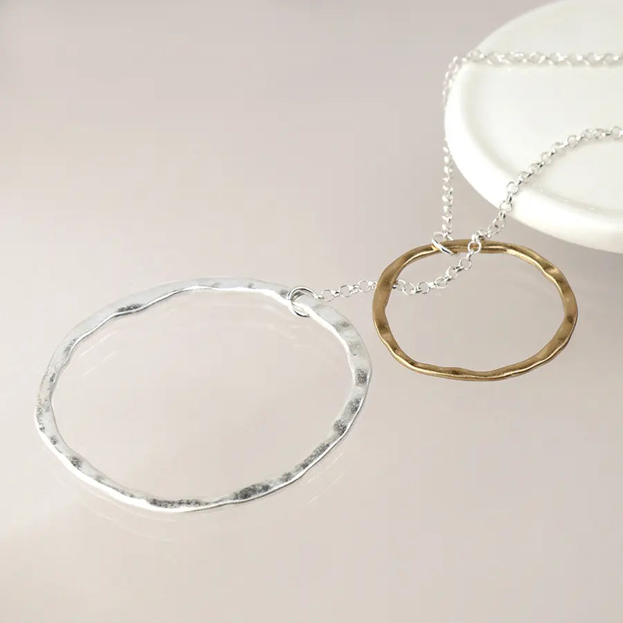 Silver plated fine chain necklace with a small faux gold plated hammered hoop, threaded through a larger silver plated hammered hoop.