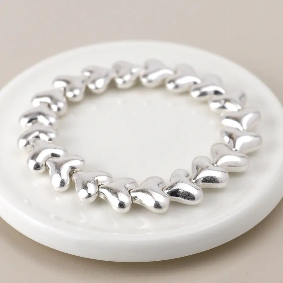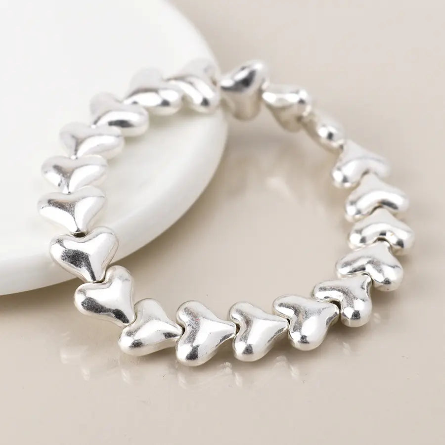 A stunning bracelet ideal as a gift or treat to yourself. Silver plated stretch bracelet with worn finish chunky hearts.