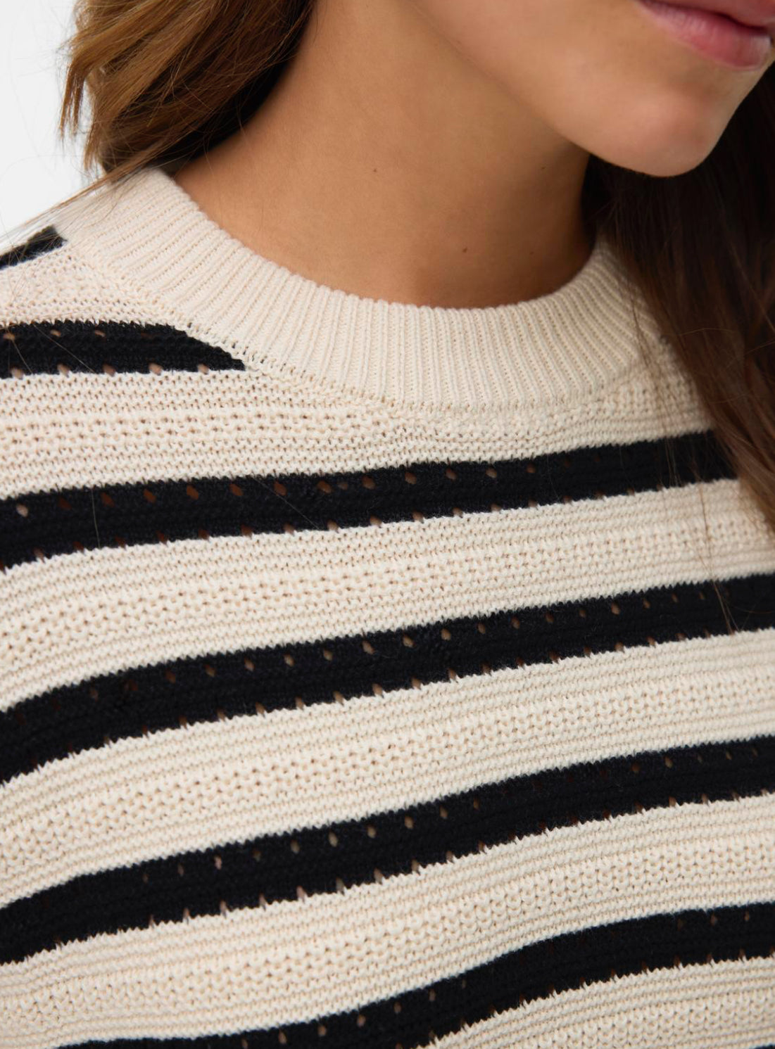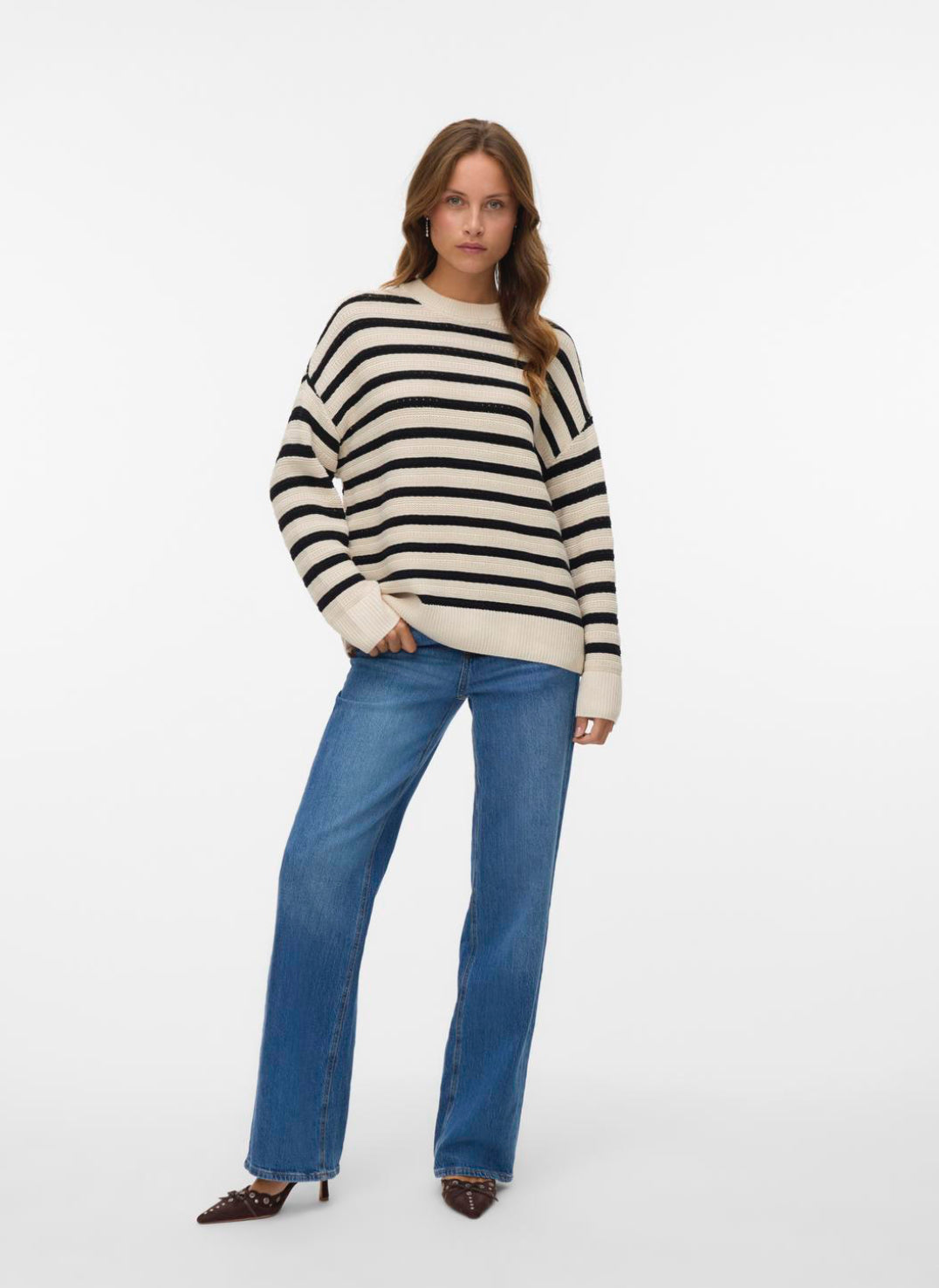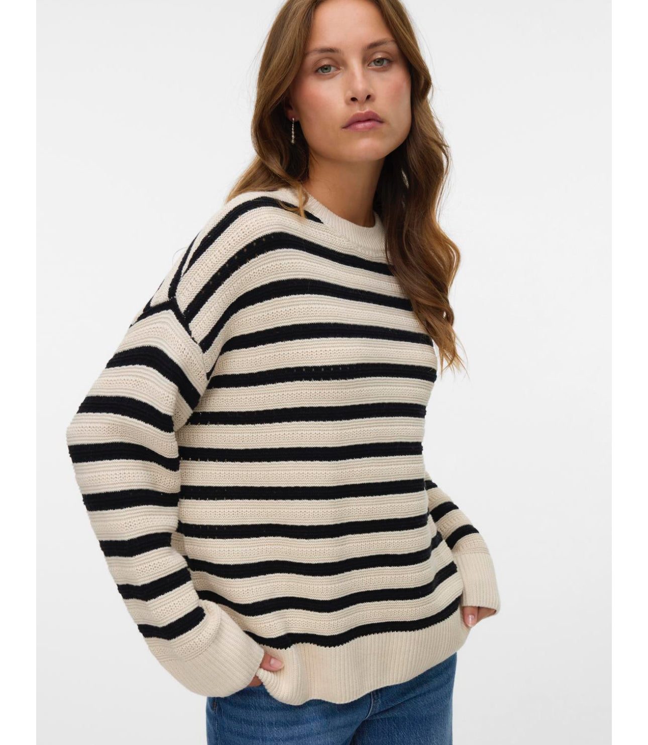 A stylish versatile cotton jumper from the brand Vero Moda. Beautifully made in 100% recycled cotton. Not too heavy, ideal to transition from Summer to Autumn. Designed with a crew neckline and ribbed cuffs, it will soon become your go-to jumper.